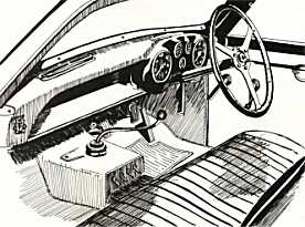 | Two drawings of Farina Jupiter E0 SA 7R produced by Malcolm Bergin in 1971 for the New Zealand Jupiter Register -his Register was the very first publication of any kind devoted to the Jupiter. It was much more than a register with interesting artwork and historical texts. | The above drawing shows just how much the interior of the Farina Jupiter was modified, even having a non Jowett gearbox and shift. It now has a non-Jowett steering column gear change |