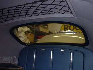 | High standard re-trim in progress, doesn't the door trim look gorgeous? | Headlining going in - trimmer enjoys a cuppa during the work | Map netting under the roof, plus new leather boot panel. |